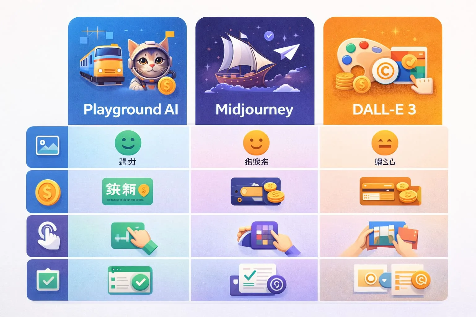 | 比較項目 | Playground AI | Midjourney (v7系) | DALL-E 3 (ChatGPT) |